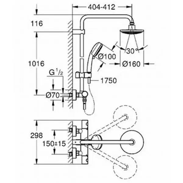 • Tuš sistem sa termostatom za zidnu instalaciju, koji se sastoji sastoji se od horizontalne zaokretne drške za nadglavni tuš 390 mm, naglavni tuš i tuš ručicom sa crevom