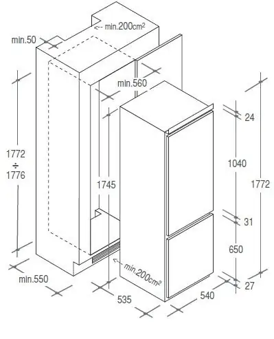 • Ugradni kombinovani frižider sa zamrzivačem dole.
