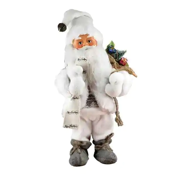 • Ima belu bradu i nosi smeđe čizme sa kanapom oko članka, što mu daje rustični izgled. Preko ramena nosi džak napravljen od materijala nalik juti, ispunjen šarenim poklonima i zelenim grančicama.