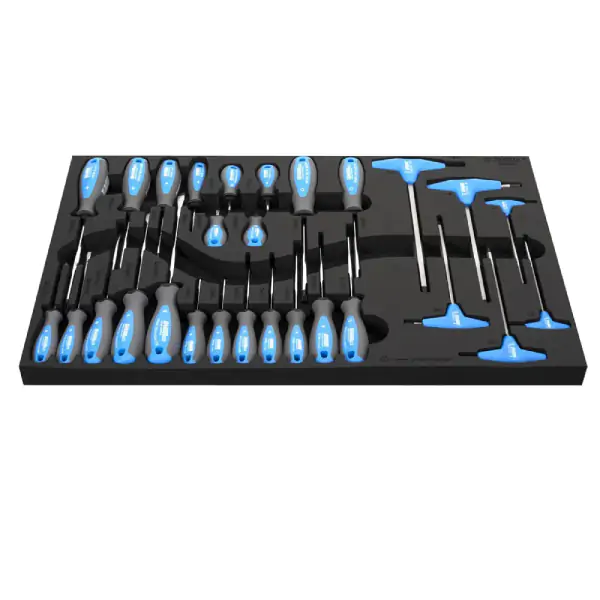 • Unior garnitura od 28 profesionalnih odvijača i ključeva, smeštena u SOS uložak (964/37SOS), predstavlja sveobuhvatan set za precizne radove u mašinstvu, elektronici, autoservisima i kućnim radionicama. Težine svega 2,6 kg, ovaj komplet obuhvata pet pljosnatih TBI odvijača (611688, 611692, 611694, 611696, 612819) u dimenzijama od 0.5×3.0 mm do 1.6×8.0 mm, četiri krstasta TBI odvijača (611701, 611702, 611704, 611707) od PH0 do PH3, dva kratka pljosnata (612834, 612835) i dva kratka krstasta (612830, 612831) odvijača za rad u skučenim prostorima. Set uključuje i devet TORX odvijača sa TBI ručkom (611722-611732) u dimenzijama od TX6 do TX40, kao i šest dvostranih imbus ključeva sa loptastim vrhom i T-ručicom (608277-608282) u dimenzijama od 3 do 10 mm. Svi alati su smešteni u SOS uložak od dvoslojne polietilenske pene, otporne na maziva, ulja i benzin, što omogućava preglednu organizaciju i brzu identifikaciju nedostajućih alata. Sa 28 alata, ovaj set je idealan za profesionalce koji zahtevaju kvalitetne odvijače i imbus ključeve za svaki zadatak.