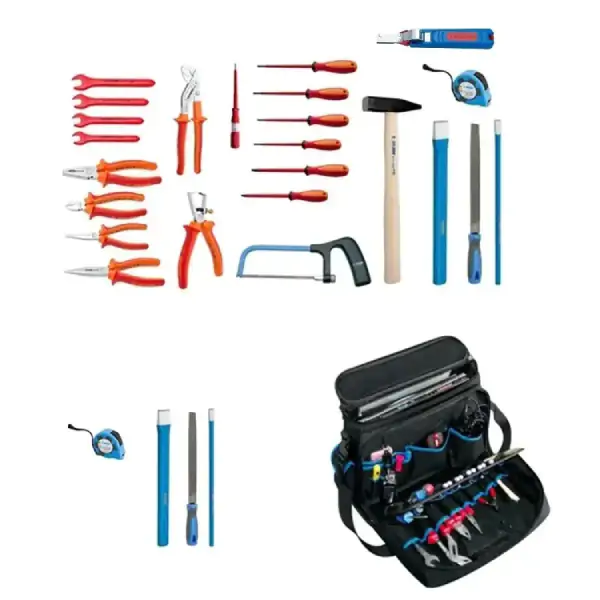 • Unior garnitura od 24 alata u torbi za alat i laptop Service od otpornog poliestera predstavlja savršenog partnera za svakog električara – bilo na terenu, u servisu ili na gradilištu, i to na promociji tokom cele godine! Ovaj komplet težine samo 6,19 kg namenjen je električarima, a sadrži VDE izolovane alate za rad pod visokim naponom do 1000 V, garantujući maksimalnu bezbednost pri radu sa strujnim instalacijama. Tu su vile jednostrani izolovani ključevi, kombinovana klešta, izolovana papagaj klešta (447/1VDEBI), pljosnata klešta (472/1VDEBI) i klešta za skidanje izolacije (478/1VDEBI), špicasta prava klešta i skidač izolacije sa kukastim nožem (385H). VDE TBI odvijači (pljosnati i PH krstasti), ispitivač napona 220-250V, pljosnati sekač za metal i električarski sekač, merna traka, ram za testeru (753P), poluokrugla turpija i bravarski čekić čine ovaj set kompletnim. Smešteni u modernu torbu Service (116.01) od otpornog poliestera koja ima i pretinac za laptop, vaši alati su uvek organizovani, zaštićeni i spremni za akciju.