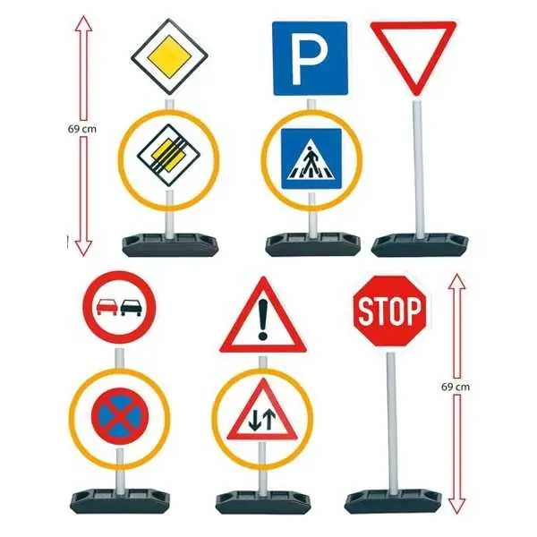 • Set sadrži 6 znakova, 12 nalepnica sa različitim saobraćajnim znacima kao i 6 postolja i 6 držača.