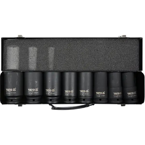 • Profesionalni set udarnih ključeva YATO, izrađen od visokolegiranog CrMo SCM-440 čelika, predstavlja vrhunsko rešenje za najzahtevnije udarne zadatke u auto-servisima, industriji i na gradilištima. Ova specijalna legura, bogata hromom i molibdenom, obezbeđuje dvostruko veću čvrstoću na istezanje i trostruko veću čvrstoću na izduživanje u odnosu na običan ugljenični čelik, što ključevima garantuje izuzetnu otpornost na habanje i deformaciju tokom rada sa visokim ciklusima udara (oko 5000 udaraca u minuti). Set obuhvata osam šestougaonih ključeva dužeg tipa (visine oko 90 mm), u veličinama od 22 do 41 mm (22, 24, 27, 30, 32, 36, 38, 41 mm), kompatibilnih sa standardnim 3/4" pogonom udarnih odvijača i račni. Fosfatirana završna obrada pruža dodatnu zaštitu od korozije i povećava trajnost površine. Svi ključevi su pažljivo organizovani u čvrstom metalnom koferu, koji štiti alat tokom transporta i skladištenja i omogućava jednostavan pristup. YATO set udarnih ključeva je sinonim za nekompromisnu izdržljivost, pouzdanost i sigurnost, čineći ga nezamenljivim alatom za profesionalce kojima je potrebna garantovana performansa pod ekstremnim opterećenjem.