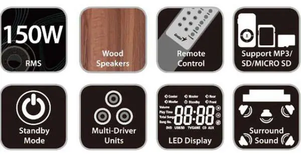 • Sadržaj paketa: - Jedan subvofer, jedan centar, dva prednja i dva zadnja zvučnika - Jedan bežični daljinski upravljač - Pet pari žica - Četiri 2RCA da 2RCA audio kabl - Jedan 3.5mm do 3.5mm audio kabl - Jedna 2RCA u 3.5mm audio kab