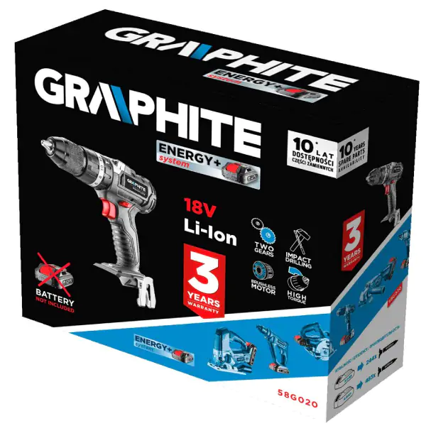 • Dvobrzinska akumulatorska bušilica GRAPHITE, kompatibilna sa 18V Li-Ion sistemom GRAPHITE Energi+, predstavlja napredno rešenje za precizan i izdržljiv rad zahvaljujući svom bezčetkicnom motoru. Ovaj motor obezbeđuje duži rad na jednom punjenju, veću efikasnost, superiornu kontrolu brzine i otpornost na prašinu i pregrevanje, čak i pri intenzivnom opterećenju. Sa dva stepena prenosa, alat nudi maksimalnu brzinu od 500 o/min u prvom stepenu za uvrtanje i 1700 o/min u drugom za brzo bušenje, uz impresivni obrtni moment od 38 Nm (meko) do 58 Nm (tvrdo uvrtanje). Precizna kontrola omogućena je 16-stepenim podešavanjem kvačila, uz dodatne opcije za bušenje i bušenje sa udarom. Samozatezna metalna stezna glava prihvata pribor prečnika 2–13 mm, dok električna kočnica motora i automatska blokada vretena povećavaju bezbednost i kontrolu. LED osvetljenje, koje se automatski aktivira, obezbeđuje jasnu vidljivost radnog polja, a ergonomski oblikovana drška sa protivkliznom površinom garantuje udoban i siguran hvat. Kompaktan dizajn, zajedno sa planetarnim zupčanicima od visokokvalitetnog čelika, čini ovu bušilicu izdržljivim i pouzdanim izborom za profesionalce i zaljubljenike u „uradi sam” projekte. Uređaj se isporučuje bez baterije i punjača.