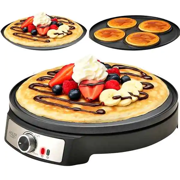 • Adler AD 3093 aparat za palačinke – crepe maker 30 cm je praktičan i multifunkcionalan kuhinjski uređaj koji omogućava brzu i jednostavnu pripremu palačinki, tortilja, američkih palačinki i raznih slanih ili slatkih specijaliteta. Zahvaljujući velikoj grejnoj ploči i snažnom grejaču, ovaj aparat za palačinke sa nelepljivom pločom idealan je za porodične doručke, proslave ili svakodnevnu upotrebu u kuhinji.