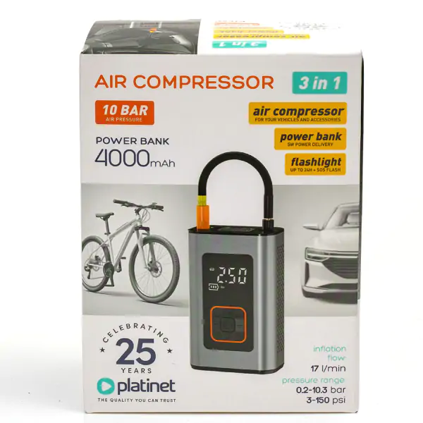 • PL PTC22 multifunkcionalni uređaj 3 u 1 predstavlja svestranog pomoćnika za svakog vozača, biciklistu i sve koji žele da budu spremni za nepredviđene situacije na putu. Ova kompaktna naprava objedinjuje snažan kompresor za gume, pouzdan power-bank od 4000 mAh i jaku LED lampu u jednom uređaju. Kompresor dostiže pritisak do 10 bara (150 PSI), što ga čini idealnim za brzo i jednostavno dopumpavanje pneumatika na automobilima, motociklima ili biciklima. Power-bank snage 5 W omogućava hitno punjenje pametnih telefona i drugih uređaja, dok USB-C i USB-A portovi obezbeđuju fleksibilnost povezivanja. LED lampa nudi neprekidno belo svetlo ili SOS mod za pomoć u nuždi, sa trajanjem osvetljenja do 24 sata. Kompaktnih dimenzija 80 x 48 x 125 mm i težine 480 g, lako staje u svaki automobilski pretinac. PL PTC22 je nezamenljiv dodatak za svako vozilo.