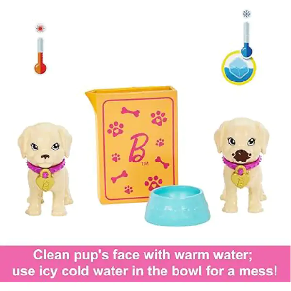 • Set podstiče negujuću igru sa Barbie lutkom i dva šteneta, donoseći pravo iskustvo brige o kućnim ljubimcima koje će oduševiti sve male ljubitelje životinja. Mali psić menja izraz lica uz pomoć color-change efekta – kada mu date posudu sa ledenom vodom, njegovo lice se menja na potpuno novi izraz, a topla voda vraća lice u prvobitno stanje, tako da se zabava može ponavljati iznova i iznova, svaki put sa novim iznenađenjem. Veći psić pije iz bočice sa hladnom vodom i piški na svoj podmetač, gde color-change efekt stvara još jedan wow trenutak koji podstiče radoznalost i učenje o životinjskim potrebama. Bočna vrata nosiljke za kućne ljubimce omogućavaju da oba šteneta odvedete kući, bilo u šetnju, u posetu prijateljima ili na putovanje. U setu su uključena dva sertifikata za usvajanje koji dodatno podstiču igru uloga – deca mogu da zapišu ime svog ljubimca, datum usvajanja i osećaju se kao pravi vlasnici. Dodatni pribor uključuje pribor za obroke (zdjelice, hrana), krevetić za udoban san i povodac za šetnje. Barbie lutka ima savitljiva kolena za realističnu brigu i maženje sa novim članovima porodice – može da sedne, klekne ili obuhvati štenad. Savršen set za razvijanje empatije, odgovornosti i mašte.