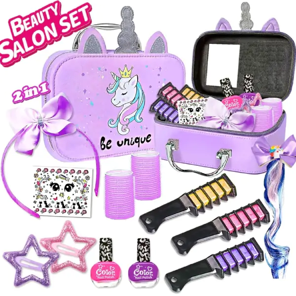• Beauty salon set u prelepom ljubičastom koferu sa motivom jednoroga idealan je za sve male kreativce koji vole da se igraju ulepšavanja! Kofer je dizajniran sa likom jednoroga – rog, uši, šljokice, svetlucavi detalji – i praktičnom ručkom za nošenje, tako da se set lako transportuje i čuva. Nakon igre, svi delovi se vraćaju u kofer, bez nereda po sobi. Set sadrži dodatke za frizerski salon: boje za kosu namenjene deci (ispirive, bez štetnih hemikalija, u nekoliko boja – roze, plava, ljubičasta), viklere (različitih veličina za uvijanje kose), rajf (ukras za glavu), šnale (male kopče za pričvršćivanje pramenova), cirkone (samolepljive ili na pritisak za ukrašavanje) i lakove za nokte (brzosušeće, ispirive, u nekoliko boja). Deca mogu da stvaraju maštovite frizure – pletenice, repove, uvojke, šiške – i sjajne stilove, farbajući kosu, uvijajući je, ukrašavajući šnalama i cirkonima, i istovremeno lakirajući nokte. Set podstiče kreativnost, maštu, osećaj za estetiku, fine motoričke veštine (uvijanje, kopčanje, lepljenje), i igru uloga (frizer, manikir, modni stilista). Idealno za decu od 3 godine naviše (uz nadzor odraslih). Savršen poklon za rođendane, praznike ili nagradu.