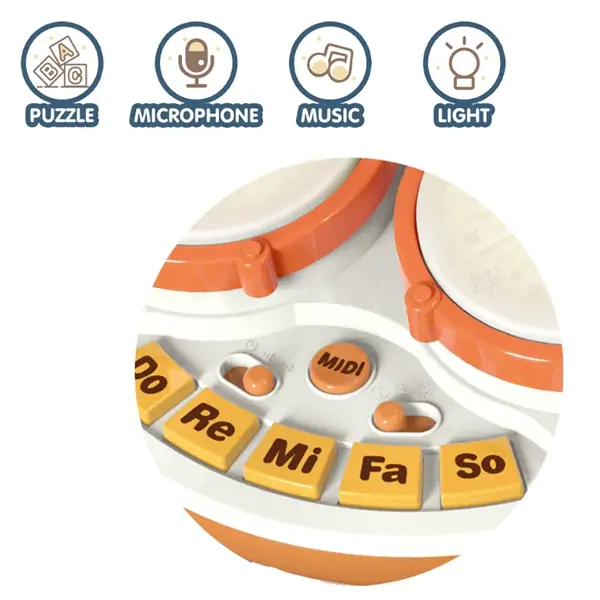 • Bubnjevi su opremljeni svetlosnim i zvučnim efektima, koji čine svaku igru dinamičnom i zanimljivom, dok mikrofon omogućava detetu da peva uz soprat bubnjeve i izrazi svoju kreativnost.