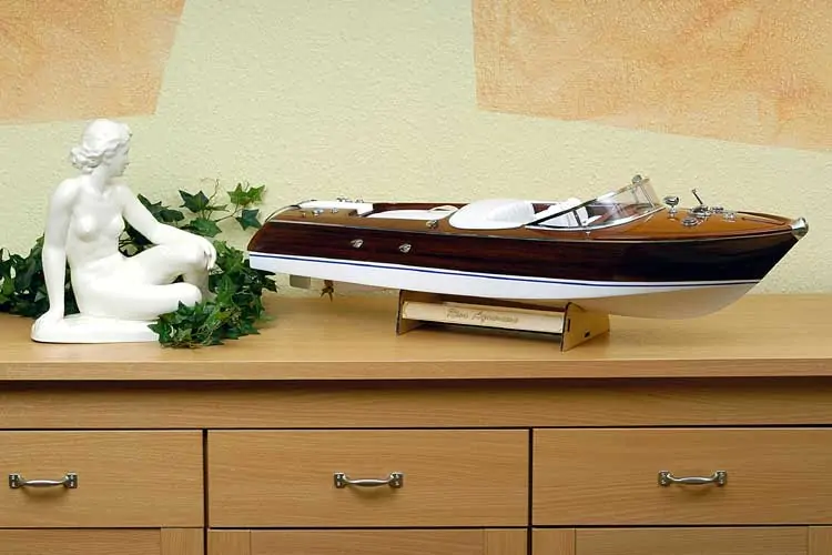 • Verna reprodukcija broda RIVA, u celosti je izgrađena s dvostrukim trupom od stakloplastike, pokrivenim kvalitetnim drvetom, koji je iznad vodene linije i palube lakiran sa lakom visokog sjaja, sedišta su urađena od kvalitetnog skaja. Jedinstven na tržištu, dvostruko ojačani trup sprečava vodu da prodre u unutrašnjost broda. Pripremljena je za vožnju sa snažnim elektro motorom klase 540, servo kormilom i elektroničkom regulacijom broja obrtaja. Završni elementi su kromirani sto omogućuje da ovaj veliki brod služi za ukras ili vožnju ili oboje zajedno.