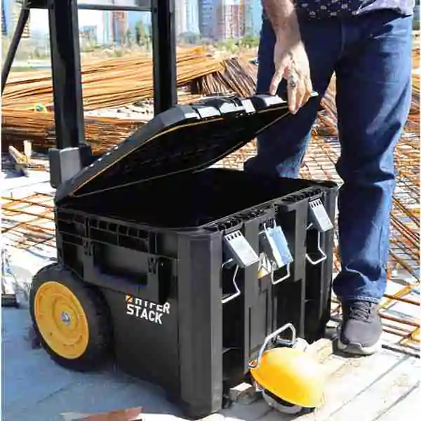• Izdržljivi 9-inčni (230 mm) točkovi olakšavaju transport teških alata, dok izvlačiva drška omogućava jednostavno pomeranje i upravljanje kutijom bez napora. Kutija je izrađena od visokokvalitetne plastike i čelika, pružajući otpornost na udarce i dug vek trajanja, čak i pri intenzivnoj upotrebi.