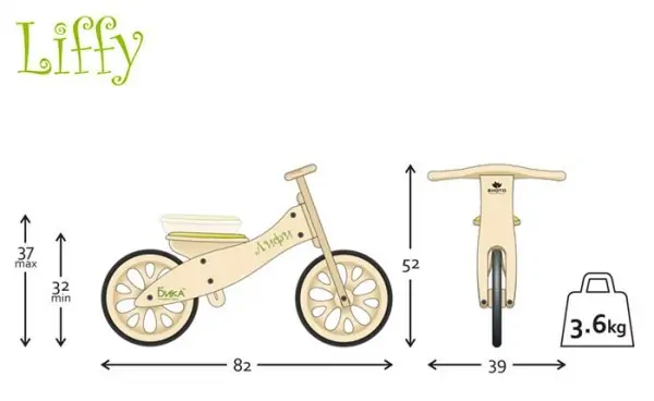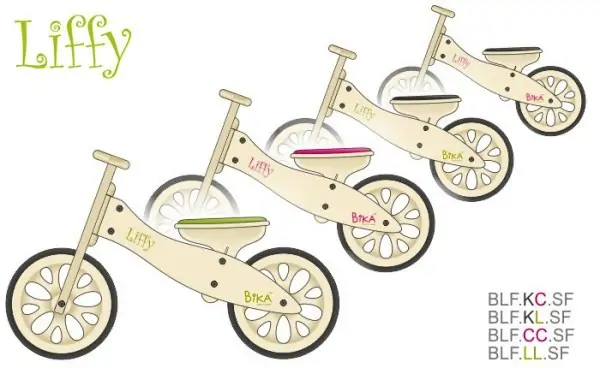 Zglob viljuške je koncipiran tako da ograničenim zakretanjem onemogući “pobadanje” i padove, kao i da se izbegne priklještenje dečijih prstiju. Da bi se ispoštovali zahtevi preciznosti i izdržljivosti, svi mehanički elementi zgloba izrađuju se od laserski sečenog nerđajućeg čelika koji je pokriven elementima od punog drveta. Ne zahteva nikakvo održavanje.Ručice upravljača su, kao i ostatak drvenih delova, zaštićene samo premazom na bazi čistog pčelinjeg voska i najkvalitetnijeg tungovog ulja, što znači da dete nije u kontaktu sa sintetičkim materijalima nekontrolisanog kvaliteta. Krajevi rukohvata imaju proširenja čiji je cilj zaštita ruku od povreda prilikom prolaženja pored tvrdih objekata i površina (pogotovu zidova).Sedišta svih BIKA modela su, za razliku od većine sličnih proizvoda drugih proizvođača, presvučena prirodnom kožom i mogu se podešavati po visini jednostavnim zahvatom, bez demontaže ostalih delova. Zavisno od modela, moguće je birati boju sedišta.Točkovi BIKA™ su od drveta obavijenog punom gumom koja ne zahteva održavanje. Osovine se nose na kvalitetnim kugličnim ležajevima.Rasklopivi stalak će svakako pomoći da se izbegnu oštećenja drveta kada se BIKA™ ne koristi. Plus jedna igračka manje za preskakanje u stanu.