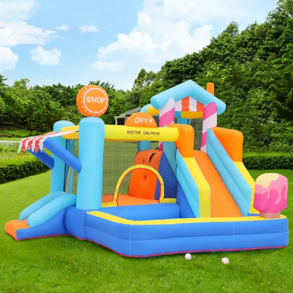 • Dečija naduvavajuća igraonica „Slatka Kuća & Prodavnica“ osmišljena je da na prvi pogled osvoji dečija srca, a roditeljima i organizatorima pruži sigurnost, kvalitet i bezbrižnost. Razigran dizajn u obliku slatke kuće i prodavnice stvara bajkovitu atmosferu u kojoj se deca rado igraju, smeju i provode nezaboravne trenutke. Bogat sadržaj omogućava skakanje, penjanje, spuštanje niz tobogan, igru u bazenu sa lopticama i košarkaški obruč, čime se podstiče razvoj motorike, mašte i socijalnih veština. Zahvaljujući kapacitetu do troje dece istovremeno, izdržljivoj konstrukciji od najkvalitetnije Oxford tkanine 420D + 840D i brzom postavljanju uz električnu pumpu sa konstantnim protokom vazduha, ova igraonica je idealan izbor za dečije igraonice, rođendane, proslave, manifestacije i porodična okupljanja. U pakovanju se isporučuje sa kompletom za pričvršćivanje, setom za popravku, uputstvom i torbom za skladištenje – sve što je potrebno za bezbrižnu zabavu.