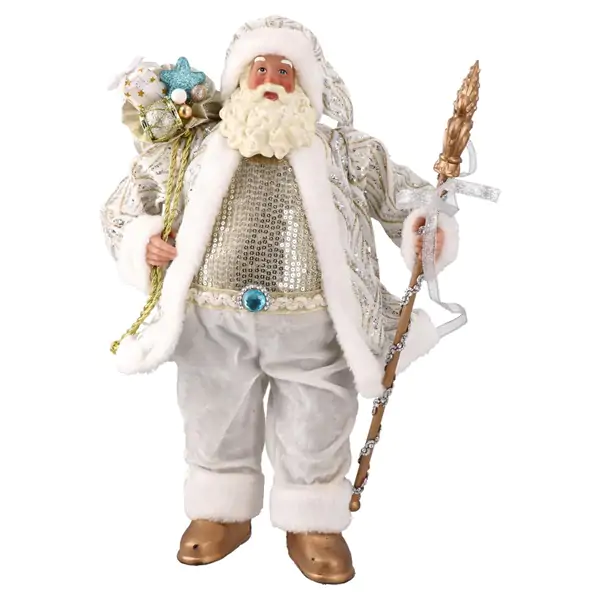 • Ovaj Deda Mraz je prava božićna zvezda, prekriven sjajem i elegancijom. Njegova figura je obučena u luksuznu, srebrno-belu odeću sa sjajnim sekicama na prsluku, koja se vide kao zimsko nebo puno zvezda. Beli, mekani krzni krajevi na kaputu i pantalonama dodaju topline i tradicionalnu čaroliju, dok mu je dug, pufasti beli brk i brada savršeno modelovani da izgledaju kao da su pokriveni ledenim kristalima.