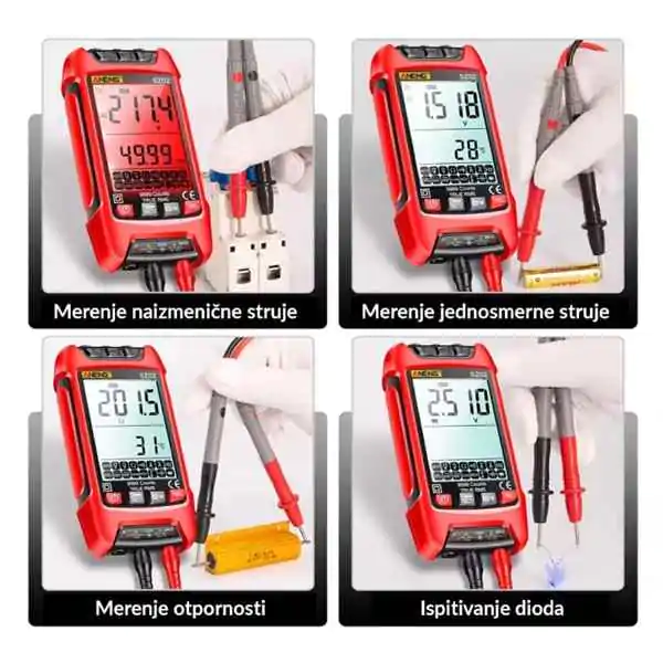 • Multimetar podržava širok spektar merenja: jednosmerni i naizmenični napon do 999.9 V, struju do 10 A, otpor do 99.99 mΩ, kao i kapacitet kondenzatora do 99.99 mF. Takođe omogućava testiranje dioda, prekida i tranzistora, kao i bezkontaktno ispitivanje faze (NCV) – funkciju koja omogućava detekciju napona bez direktnog dodira sa provodnikom.