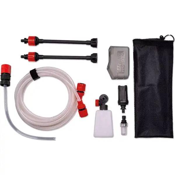 • Ergonomski oblikovana ručka sa Softgrip oblogom obezbeđuje udobno i sigurno rukovanje. U kompletu se nalaze produžeci cevi za prskanje, boca za nanošenje pene sa deterdžentom, adapter za PET boce, mrežasta torba za odlaganje pribora i zaštitni poklopac za bateriju.