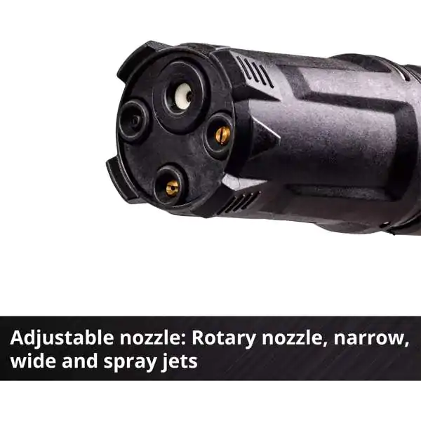 • Multifunkcionalna mlaznica sa četiri podešavanja omogućava izbor između usmerenog mlaza, širokog raspršivanja, režima za zalivanje i rotacionog mlaza za temeljno čišćenje. Perač se može priključiti direktno na baštensko crevo ili koristiti usisno crevo dužine 5 metara sa filterom za crpljenje vode iz kante, rezervoara, jezera ili ribnjaka.