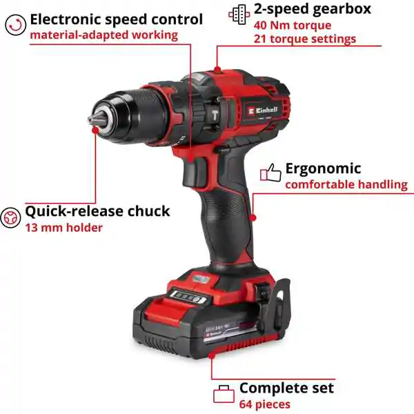 Einhell TE-CD 18/40 Li-i akumulatorska udarna bušilica set pribora od 64 komada (1×2,0Ah)
