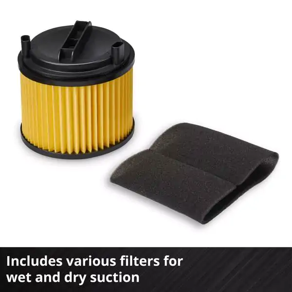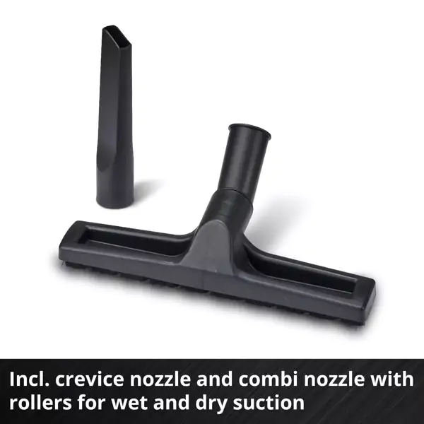 • Isporuka obuhvata kompletan set dodataka za suvo i mokro čišćenje, uključujući kombinovanu podnu mlaznicu sa točkićima, usku mlaznicu za spojeve, dvodelnu plastičnu cev, filtersku kesu za prašinu, penasti i naborani filter, kao i adapter za povezivanje sa električnim alatom. Organizovano odlaganje omogućeno je držačima za kabl i crevo, kao i torbom za pribor.