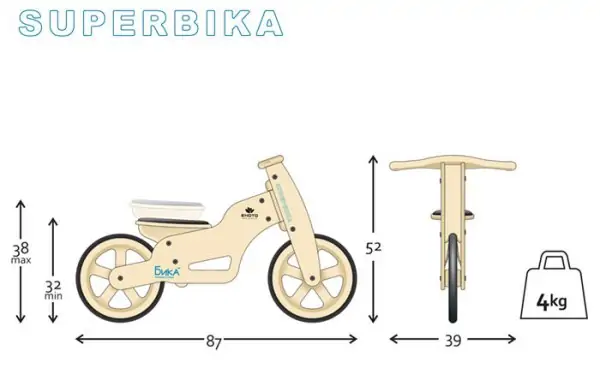 • Zavisno od modela, moguće je birati boju sedišta.Točkovi BIKA™ su od drveta obavijenog punom gumom koja ne zahteva održavanje. Osovine se nose na kvalitetnim kugličnim ležajevima.Rasklopivi stalak će svakako pomoći da se izbegnu oštećenja drveta kada se BIKA™ ne koristi. Plus jedna igračka manje za preskakanje u stanu.