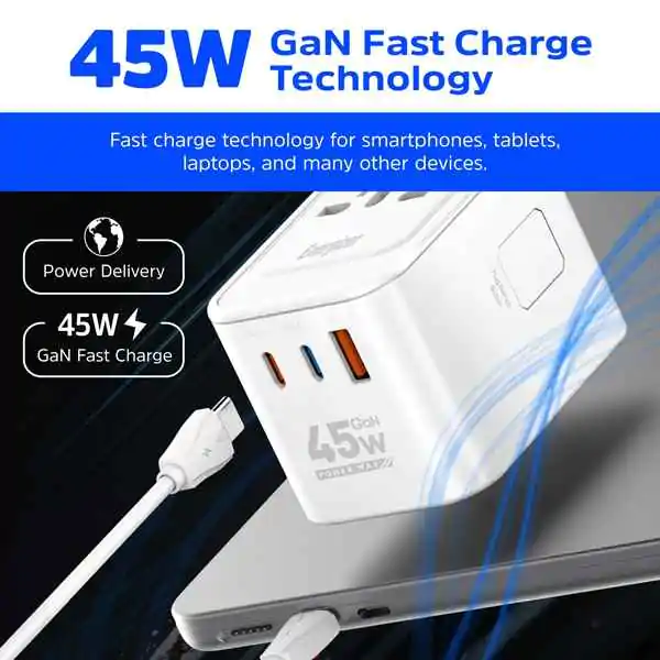 • Putni punjač ETC450 snage 45W predstavlja idealno rešenje za brzo i bezbedno punjenje telefona, tableta i manjih laptop računara, bilo kod kuće, u kancelariji ili na putovanju. Zahvaljujući podršci za univerzalni napon od 100–250V, ovaj 45W travel charger može se koristiti širom sveta, bez potrebe za dodatnim adapterima za napon.