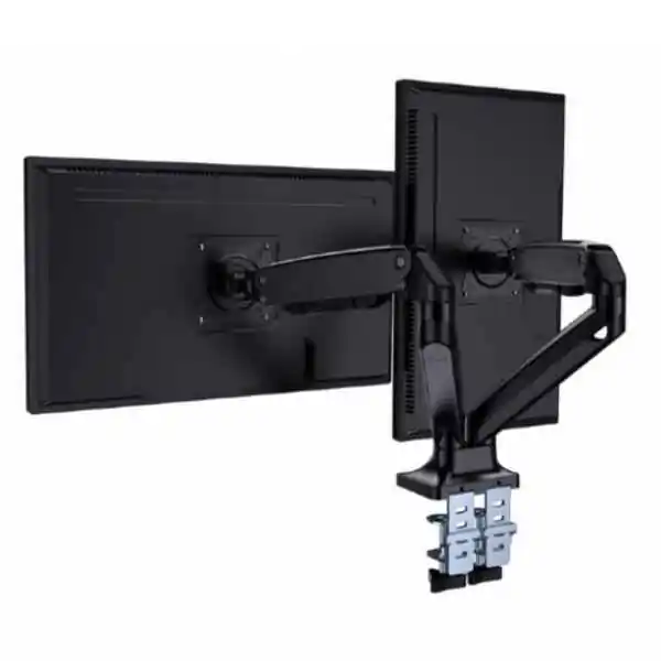 • Ovaj dupli stoni držač omogućava korisniku da jednostavno prilagodi položaj oba ekrana prema svojim potrebama. Ruke držača mogu se rotirati, naginjati, izvlačiti i uvlačiti, čime se postiže idealan ugao gledanja i smanjuje naprezanje vrata, ramena i očiju. Ekrani se mogu rotirati za 360°, što omogućava brzu promenu iz pejzažnog u portret režim. Nagib od ±50° dodatno doprinosi udobnosti i fleksibilnosti, dok visina ekrana može da se podešava u rasponu od 155 do 470 mm.