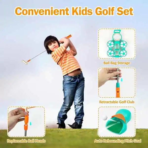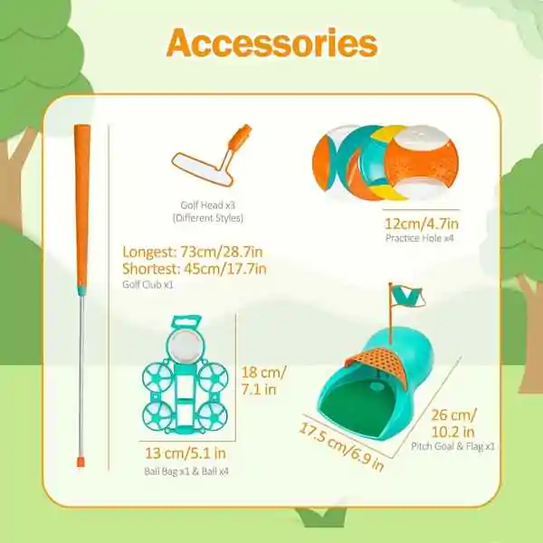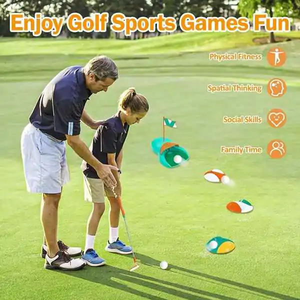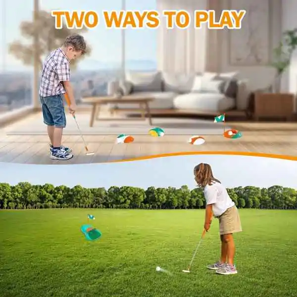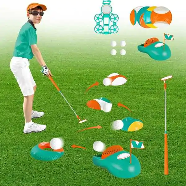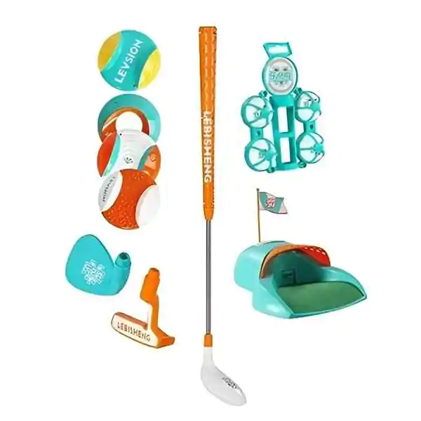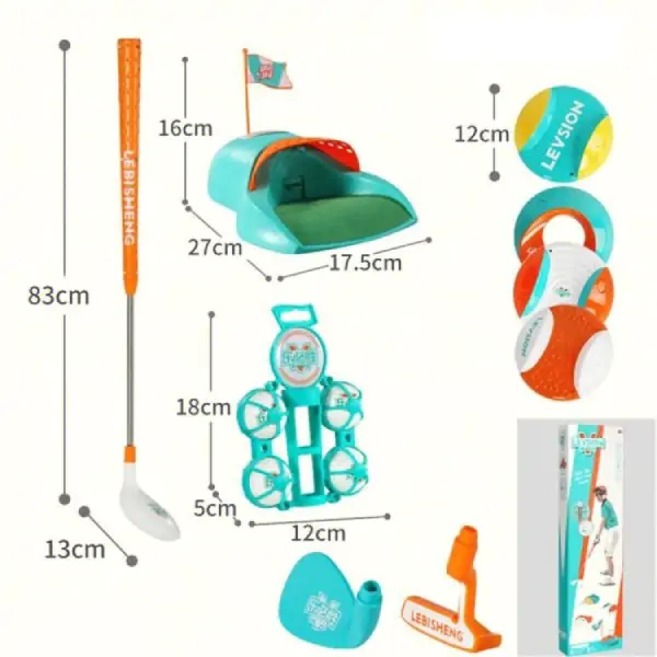 • Dečiji golf set pruža zabavu i učenje u jednom! Ovaj set je idealan za mališane koji žele da se oprobaju u ovom elegantnom sportu, bilo kod kuće, u dvorištu ili u parku. Set uključuje palice (dve ili više, različitih veličina i oblika – drvenu za udarac na duge staze i metalnu za kraće pristupe), loptice (plastične, lagane, sa rupicama ili bez) i cilj (korpu, rupu ili zastavicu) u koju treba pogoditi lopticu. Igra se sastoji od udaranja loptice palicom i usmeravanja ka cilju, uz što manje udaraca. Pomaže deci da razvijaju preciznost (gađanje mete), koordinaciju oka i ruke (tempo, snaga, pravac) i strpljenje (svaki udarac zahteva koncentraciju). Kroz igru, deca uče osnovna pravila golfa, ali i važne životne veštine – upornost, samokontrolu, prihvatanje promašaja i radovanje uspehu. Lagani i sigurni materijali (plastika, pena, lagani aluminijum) čine ga pogodnim za najmlađe igrače – palice su lake za držanje, loptice ne lete daleko niti brzo, a cilj je stabilan i mekan. Set je prenosiv (torba ili kofer za nošenje). Savršen poklon za decu od 3 godine naviše. Preporučuje se za igru na otvorenom, ali i u dnevnoj sobi (sa mekim lopticama).