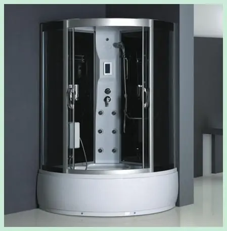 Hidromasažnatuš kabina dimenzija 120x120x215cm ,sa hidromasažnomkadom. Hidromasažnatuš kabina, izrađena od sivog kaljenog stakla, aluminijumskoghromiranog sivog okova i akrilne duboke tuš kade. Leđa kabine suizrađena od crnog kaljenog stakla i sadrže akrilni stub na kome supostavljene komande vodovodnog i elektro razvoda. Kabinasadrži centralni tuš, jednoručnu slavinusa keramičkim umetkom, mešač, usmerivač vode na različiteizlaze, šest akupuntkurnih mlaznica, ručni tuš, policu, ogledalodozere za tečni sapun i šampon i masažu stopala. U okviruelektrične instalacije kabina sadrži: kompjuter sa displejom nakome su postavljeni prekidači, ventilator, FM radio prijemnik,telefonski prijemnik i 12 V osvetljenje. Kadaove kabine je hidromasažna i poseduje četiri mlaznice sa kombinacijom voda vazduh kao i podvodno svetlo. Odlikujese kvalitetnom izradom i primamljivimdizajnom.