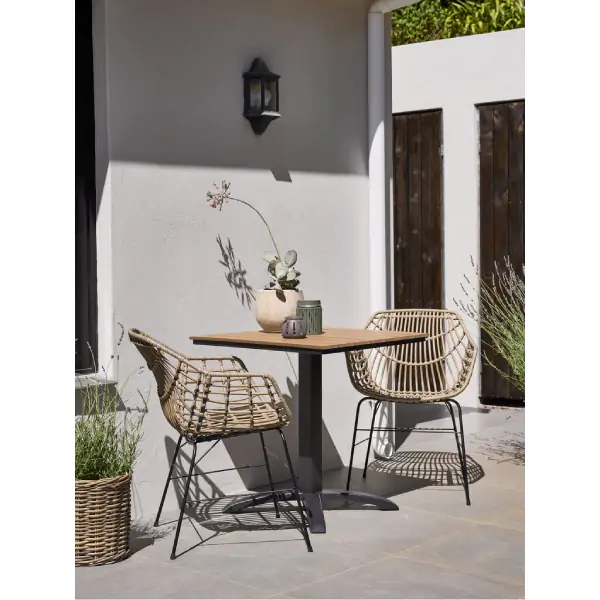 • Baštenska stolica ILDERHUSE natur i bistro stočić HOBRO u prirodnoj boji predstavljaju savršen komplet za opremanje vaše terase, balkona ili bašte, kombinujući moderan dizajn sa izdržljivim materijalima. Stolica ILDERHUSE, dimenzija 60x79x62 cm, izrađena je od čelične konstrukcije i PETAN (polietilen) tkanja na naslonu, sedištu i rukama, što joj daje prozračnost i udobnost. Premazana je prahom radi dugotrajnosti i testirana do 110 kg. Bistro stočić HOBRO, kvadratnog oblika dimenzija 70x70x73 cm, sa ramom i nogama od aluminijuma i površinom od veštačkog drveta (polistiren), lagan je i jednostavan za održavanje, a pogodan je i za manje balkone. Oba komada se lako čiste vlažnom krpom, a preporučuje se njihovo odlaganje u zatvorenom prostoru tokom zime.