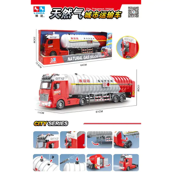 • Realističan kamion cisterna za gas donosi uzbudljive logističke avanture na gradilište, benzinsku pumpu ili u svet mašte! Ovaj impresivni model dizajniran je sa pažnjom na detalje, uključujući otvaranje vrata kabine koja omogućavaju pristup unutrašnjosti i smeštaj vozača, kao i otvaranje vrata cisterne koja dodaju dodatnu dozu autentičnosti i pristupačnosti za igru. Pritiskom na volan oglašava se glasna truba, dok svetlosni i zvučni efekti dodatno oživljavaju igru – deca će uživati u realističnim zvucima motora, trube i svetlima koja prate vožnju, stvarajući potpuni doživljaj vožnje opasnog tereta. Funkcionalno crevo za igru omogućava simulaciju punjenja i pražnjenja gasa ili tečnosti, tako da mali vozači mogu da se osećaju kao pravi šoferi cisterne. Prikolica se skida i kači na kamion, što omogućava različite konfiguracije igre – kamion može raditi sam ili sa prikolicom. Dimenzije vozila su 64 x 13.5 x 23 centimetra, što ga čini dovoljno velikim za uočljive detalje, a opakom praktičnim za igru i čuvanje. Izrađen je od izdržljive plastike koja podnosi aktivnu igru, padove i transportne poduhvate. Savršen za mališane koji vole velike mašine, transport i opasne terete. Preporučuje se za decu od 3 godine naviše.