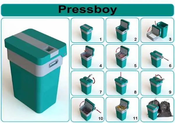 • Novi revolucionarni proizvod PRESSBOY ™ je idealan za skupljanje otpada iz kuhinje, kupatila, WC-a i iz svih prostorija u kući i sa posla, i svuda gde je potrebno sakupljati otpad u malim kantama