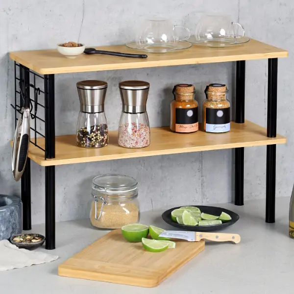 • Moderni KESPER® dvonivoi kuhinjski stalak kombinuje funkcionalnost i stil, pružajući dodatni prostor i praktično rešenje za organizaciju. Izrađen od visokokvalitetnog MDF-a i metala, stalak je savršen za odlaganje začina, ulja, biljnih dodataka, čaša ili šolja, čime sve što vam je potrebno za kuvanje ostaje lako dostupno. Tri dodatna mrežasta kuka sa strane omogućavaju praktično odlaganje kuhinjskih pribora i peškira, čime su najvažniji predmeti stalno pri ruci. Zahvaljujući svom univerzalnom dizajnu, stalak se može koristiti i u kupatilu za odlaganje krema, paste za zube, proizvoda za stilizovanje kose, kao i za kačenje makaza i pinceta. Dvonivoi KESPER® stalak predstavlja svestrano i estetski dopadljivo rešenje, idealno za optimizaciju prostora i organizaciju u kuhinji, kupatilu ili bilo kom drugom delu doma, unoseći red, praktičnost i moderan izgled u svaki prostor.