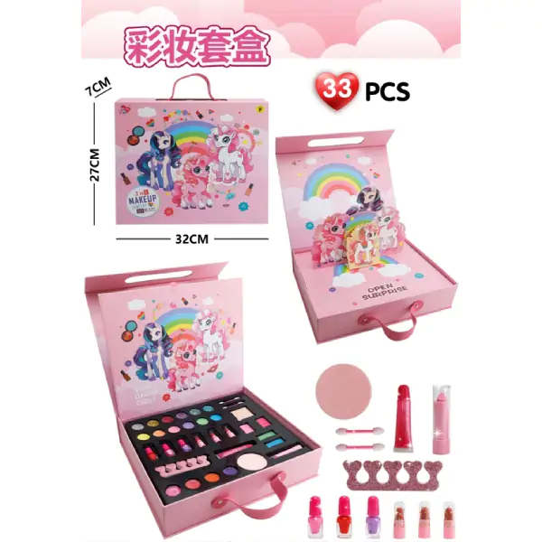 • Veliki set sa šminkom u obliku jednorog kofera oduševiće svaku malu ljubiteljicu lepote! Ovaj šarmantni set dolazi u prelepom koferu dizajniranom kao jednorog – sa rogom, ušima, svetlucavim detaljima i dugmetom za otvaranje. Kofer se lako nosi (praktična ručka) i čuva, a nakon igre svi delovi se vraćaju unutra, bez nereda po sobi. Set sadrži čak 33 dela šminke i dodataka: senke za oči u različitim bojama (roze, ljubičasta, plava, zlatna), rumenilo, sjaj za usne, lakove za nokte, aplikatore (sunđere, četkice), ogledalo, možda i nalepnice za nokte, šablone za šminku, ili ukrasne kristale. Svi proizvodi su bezbedni za decu – ne sadrže štetne hemikalije, lako se skidaju vodom i sapunom, i hipoalergeni su. Dimenzije kutije su 32 x 27 x 7 centimetara, dovoljno prostrane da sve stane, a opet kompaktne za nošenje. Set podstiče kreativnost, maštu, razvija fine motoričke veštine (držanje četkica, nanošenje šminke), osećaj za lepotu i estetiku, samopouzdanje i igru uloga (šminker, maniker, modna stilistkinja). Savršen poklon za rođendane, praznike ili kao nagrada. Preporučuje se za decu od 3 godine naviše (uz nadzor odraslih).