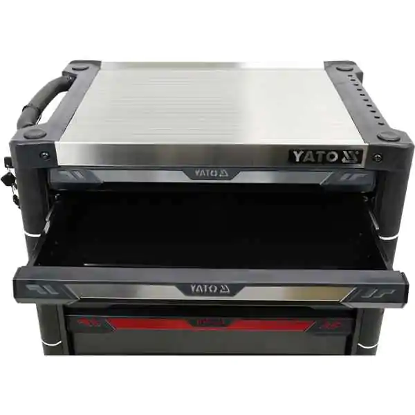 • Novi servisni ormar YT-09032 odlikuje se jedinstvenim dizajnom i bezbednosnim mehanizmom koji onemogućava istovremeno otvaranje više od jedne fioke. Na taj način se povećava stabilnost ormara i bezbednost tokom rada. Sve fioke se otvaraju glatko i tiho zahvaljujući upotrebi specijalnih vođica sa ležajevima, dok se kompletan ormar zaključava pomoću centralne brave.