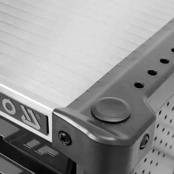 • Ormar je opremljen čvrstom metalnom radnom površinom, pogodnom za razne servisne i montažne poslove, kao i praktičnom ručkom koja olakšava pomeranje ormara po radionici. Na bočnim panelima nalazi se univerzalna perforacija, koja omogućava dodatnu organizaciju prostora i ugradnju dodatne opreme. Fleksibilni ugaoni odbojnici štite ormar i okolne elemente od oštećenja prilikom pomeranja.