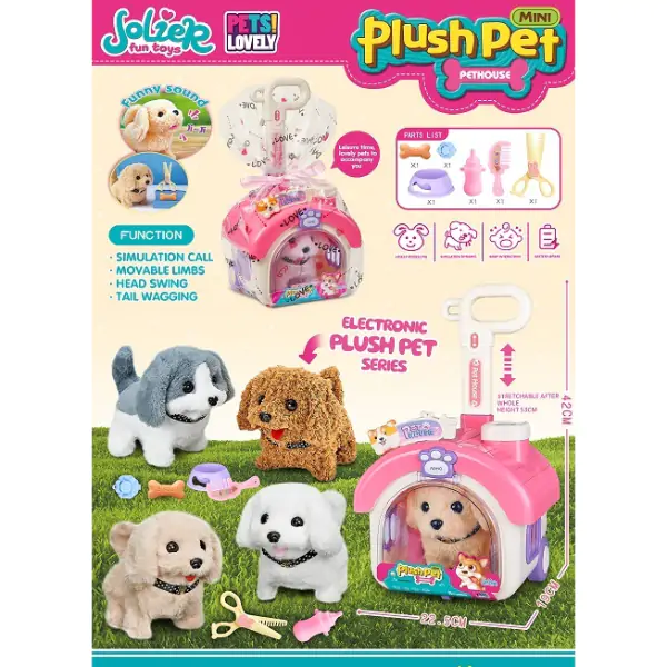 • Preslatki plišani pas smešten u svojoj korpi koja se može vući poput kofera pruža deci zabavnu i interaktivnu igru, kombinujući društvo ljubimca sa praktičnošću nošenja. Pas laje (realistični zvuci, možda i cvili, dahti), ima pokretne šape (mahanje ili podizanje), klati glavom (levo-desno ili gore-dole) i maše repom, čineći igru realističnom i podstičući dete na maženje, igru i brigu. Korpa je opremljena točkićima i ručkom, tako da se lako vuče za sobom – kao mali kofer za ljubimca. Dete može da vodi psa u šetnju, u goste, u park, ili u sobu. U kompletu dolaze posuda za hranu (za vodu i hranu), kost (igračka za žvakanje), češljić (za češljanje dlake) i dodaci za negu (možda šampon, četka, ogrlica). Dete može da hrani psa, češlja ga, daje mu kost, i uči odgovornosti i empatiji. Igračka podstiče razvoj empatije (briga o živom biću), odgovornosti (redovno hranjenje, čišćenje), koordinacije (hvatanje, češljanje, vučenje korpe), fine motorike, i mašte (šetanje, lečenje, treniranje). Dimenzije pakovanja su 22.5 x 19 x 42 centimetara. Pas je izrađen od mekanog, nežnog pliša, bezbednog za decu. Baterije su uključene ili nisu (proveriti). Preporučuje se za decu od 3 godine naviše.