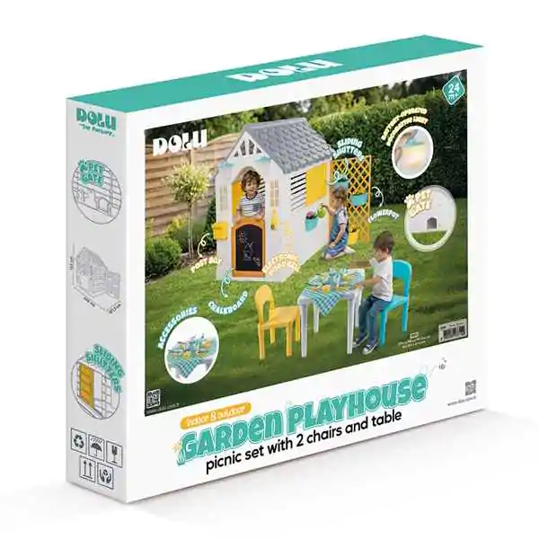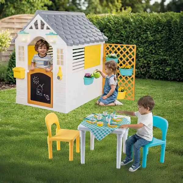 • Kućica za decu sa stolom i stolicama model 026798 predstavlja savršeno rešenje za kreativnu igru na otvorenom i u zatvorenom prostoru. Ova moderna dečija kućica kombinuje zabavu i edukaciju, pružajući mališanima sopstveni kutak za igru, crtanje i druženje. Prednja vrata funkcionišu kao tabla za pisanje kredom, što podstiče razvoj mašte i kreativnosti kod dece.