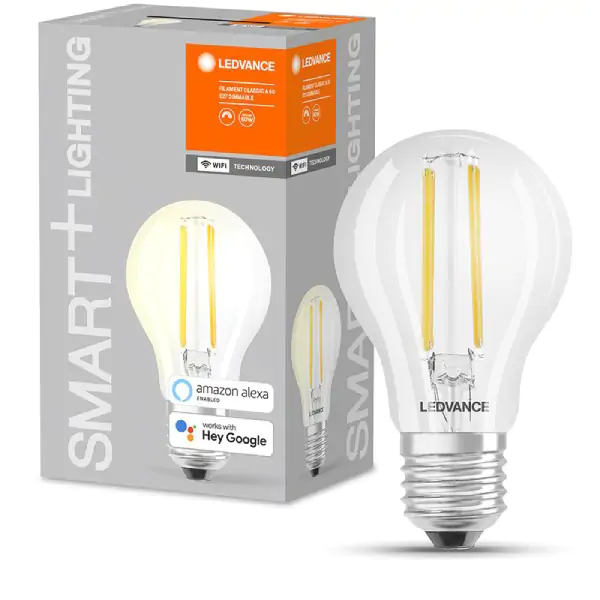 • Ledvance SMART+ Filament WiFi Classic A60 E27 dimabilna LED sijalica predstavlja moderno rešenje za energetski efikasno i pametno osvetljenje doma ili radnog prostora. Sa snagom od 6W, ova sijalica pruža svetlosni efekat ekvivalentan klasičnoj sijalici od 60W, čime značajno smanjuje potrošnju energije i troškove električne energije. Emituje toplo belu svetlost od 2700K, koja stvara prijatnu i udobnu atmosferu u prostoriji, dok njen svetlosni fluks od 806 lumena osigurava dovoljno osvetljenja za svakodnevne aktivnosti. Ugao snopa svetlosti od 300 stepeni omogućava široku rasprostranjenost svetla, što doprinosi ravnomernom osvetljenju.Ova LED sijalica je dimabilna, što znači da je moguće podešavati intenzitet svetla putem aplikacije SMART+, a kompatibilnost sa Google Assistant i Amazon Alexa omogućava glasovnu kontrolu i integraciju u pametne kućne sisteme. Napravljena je bez prisustva žive, što je čini sigurnom za upotrebu i ekološki prihvatljivom. Radni vek sijalice je impresivnih 15.000 sati ili 100.000 paljenja/gašenja, što garantuje dugotrajnu upotrebu bez potrebe za čestom zamenom. Energetska klasa E i potrošnja od samo 6 kWh/1000h dodatno potvrđuju njenu efikasnost.Dimenzije sijalice su 105 x 60 x 60 mm, a masa je 31 g, što je čini laganom i jednostavnom za montažu u standardna E27 grla. Stepen zaštite IP20 znači da je pogodna za unutrašnju upotrebu. Ledvance SMART+ Filament WiFi sijalica kombinuje štednju energije, dug vek trajanja, funkcionalnost i pametnu kontrolu, pružajući optimalno osvetljenje i udobnost u svakom prostoru.