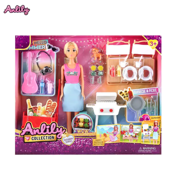 • Ovaj set omogućava mališanima da kroz igru ožive zabavne i kreativne piknik avanture, bilo da se radi o rođendanskom slavlju, porodičnom izletu ili druženju sa prijateljicama. Set uključuje lutku (devojčicu ili devojku) spremnu za piknik – obučenu u letnju, ležernu kombinaciju (haljina, šešir, sandale). Dodaci su izuzetno bogati: roštilj koji se može otvoriti i na koji se stavlja hrana (plastični odresci, kobasice, kukuruz), sto i stolice (sklopive ili fiksne) za postavljanje trpeze, raznovrsna hrana (sendviči, voće, kolači, sladoled) i piće (sokovi, limunada) sa čašama, gitara za muziku i pevanje uz logorsku vatru ili u hladu drveta, fotoaparat za večne uspomene. Dodatni dodaci mogu uključivati piknik korpu, ćebe, tanjire, escajg, suncobran, leptire ili cveće za dekoraciju. Lutka može da sedi za stolom, drži hranu, pije, svira gitaru ili fotografiše. Set podstiče maštu, igru uloga (domaćin, gost, kuvarka, muzičarka, fotograf), kreativne scenarije (planiranje piknika, postavljanje stola, pevanje, fotografisanje). Idealno za decu koja vole društvene igre, piknik avanture, prirodu, druženje i oponašanje odraslih. Preporučuje se za decu od 3 godine naviše.