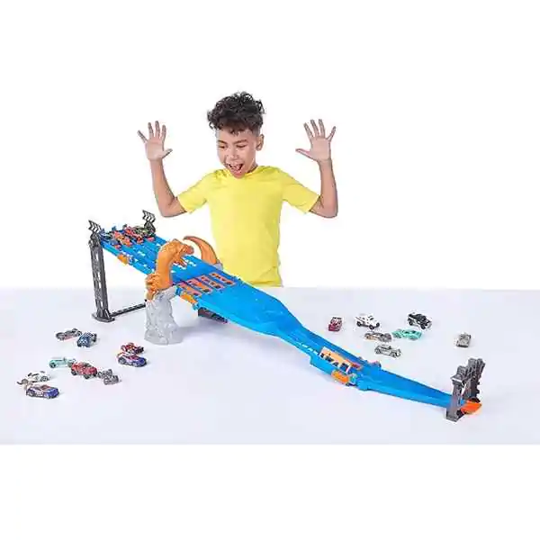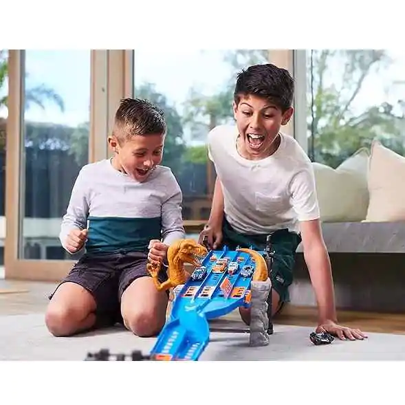 • Glavna posebnost ove staze je interaktivni raptor koji može iznenada da „napadne“ i eliminiše vozila, čineći svaku trku drugačijom i uzbudljivijom. Deca mogu organizovati takmičenja sa više učesnika, razvijati takmičarski duh i uživati u neizvesnim završnicama. Set dolazi sa ekskluzivnim Metal Machines die-cast automobilom, spremnim za start odmah po otvaranju pakovanja.