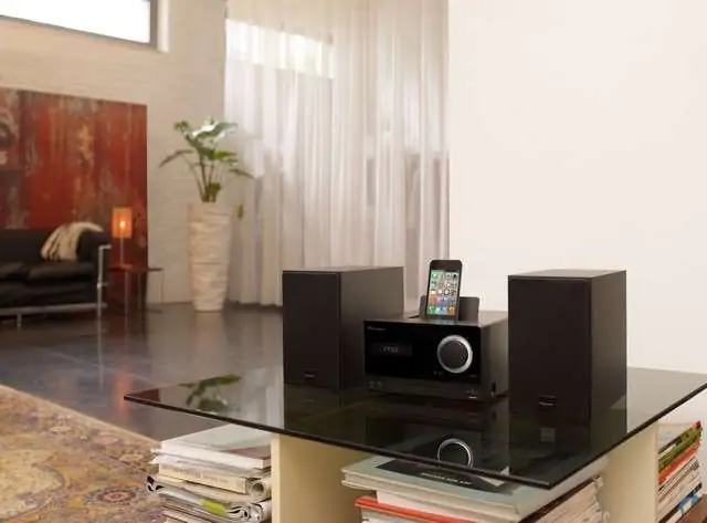 • Reprodukuje CD, ima stanicu za vaš iPod ili iPhone i jedan USB priključak za vaš iPad, sa punjenjem. Mikro linija dovoljno mala da bude diskretna čak i sa dva zvučnika.
