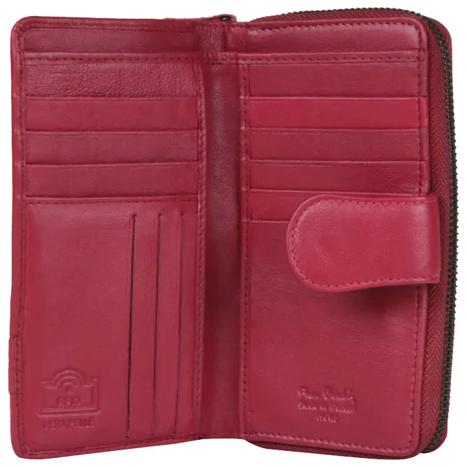 • Pierre Cardin ženski kožni novčanik u crvenoj boji nudi sigurno i elegantno rešenje za organizaciju, sa kombinovanim zatvaranjem – glavni deo se zatvara zipom, dok prednji deo ima kopču za brz pristup. Unutrašnjost uključuje odvojivu pregradu sa zipom za sitan novac, kao i više pretinaca za kartice i dodatnih pregrada za uredno odlaganje. Dimenzija 9,5 × 16,5 × 3 cm.