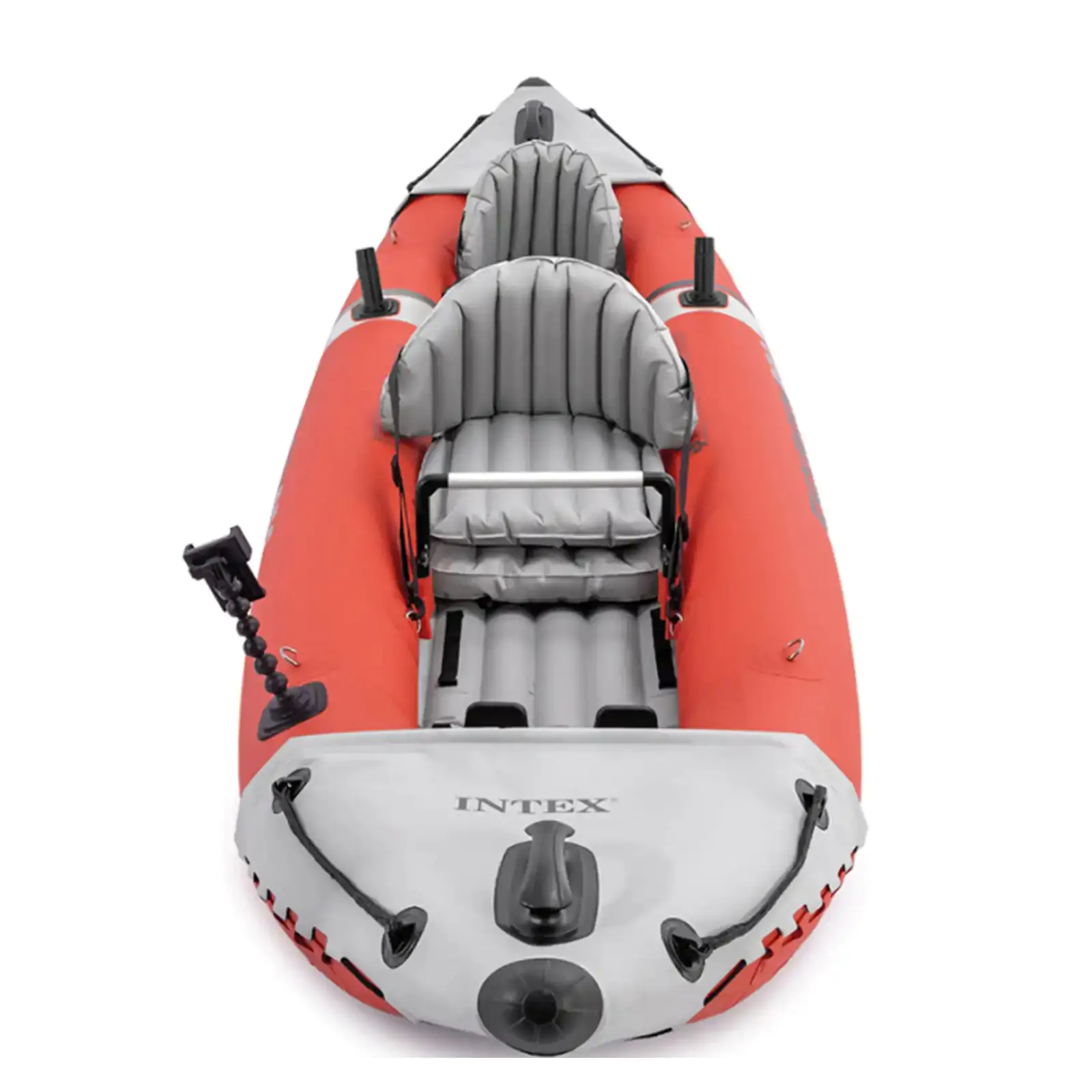 • Kajak dolazi sa aluminijumskim veslima dužine 218 cm, ručnom pumpom visokog kapaciteta i dve odvojive kobilice za optimalno upravljanje u plitkim i dubokim vodama. Posebno se izdvaja dodatak u vidu nosača za GPS uređaje, kamere i mobilne telefone, kao i dva držača za štapove za pecanje, što ga čini savršenim za ribolovce.