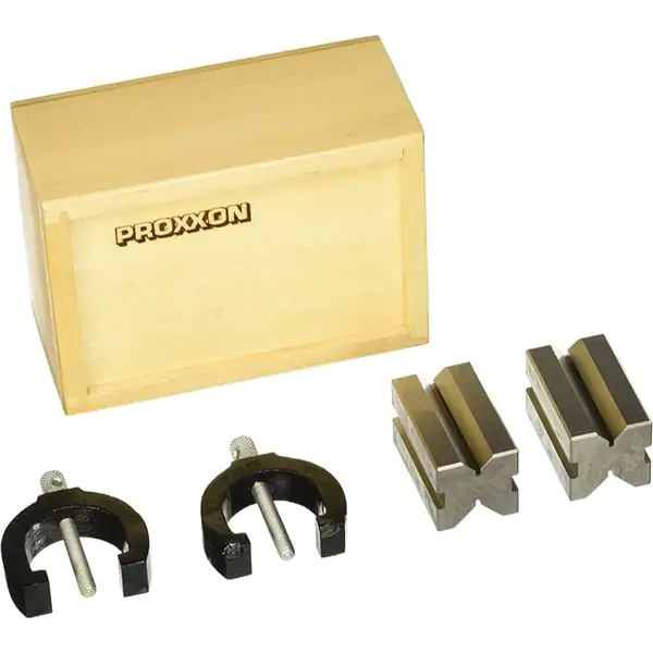 • Proxxon precizni V-blokovi su nezaobilazan alat svakog majstora koji radi sa okruglim, cilindričnim ili nepravilnim radnim komadima visoke tačnosti. Izrađeni su od kaljenog čelika i brušeni u paru sa najvećom preciznošću, što garantuje savršenu podudarnost i apsolutnu tačnost pozicioniranja. Svaki blok ima četiri različite dubine V-ureza pod uglom od tačno 90°, omogućavajući sigurno i stabilno stezanje predmeta prečnika od najmanjih pa sve do 25 mm. Čvrsta stezna klema i nareckana ručica obezbeđuju izuzetno jako i nepokretno fiksiranje radnog komada, čak i pri najzahtevnijim operacijama glodanja, bušenja ili merenja. Idealan dodatak za Proxxon mikro glodalice MF 70 i BFW 40/E, koordinatne stolove ili mernu opremu. Dolaze u pari, upakovani u kvalitetnu drvenu kutiju sa kliznim poklopcem koja štiti alat i olakšava organizaciju radionice.