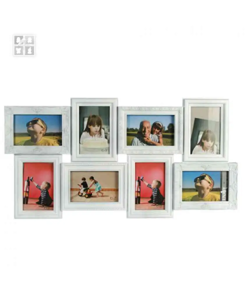 • Plastični beli ram za osam slika sastoji se od osam ramova u koje možete smestiti 4 slike i to 10x15cm i 4 slike dimenzija 15x10cm...kada malo bolje pročitate to su iste dimenzije slike ali začkoljica je u orijentaciji slika...portret ili obratno
