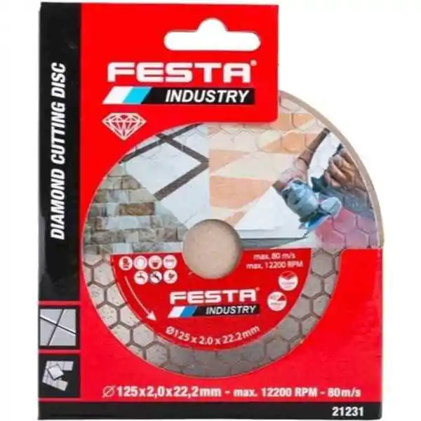 • Profesionalna dijamantska turbo rezna ploča FESTA 125 x 2.0 mm namenjena je za zahtevno sečenje i brušenje širokog spektra tvrdih materijala. Heksagonalni segmenti sa visokim sadržajem dijamantskih zrna obezbeđuju izuzetnu agresivnost rezanja, brži prolaz i dug radni vek čak i pod velikim opterećenjem.