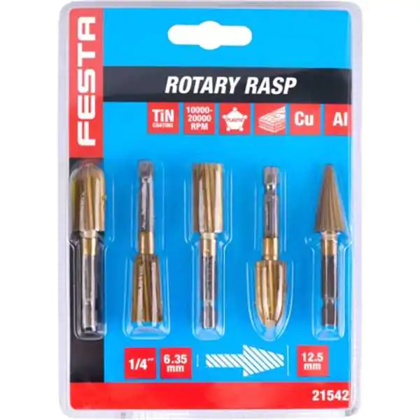 • Set rotacionih glodala FESTA uključuje 5 visokokvalitetnih alata sa šestougaonim držačem 1/4", pogodnih za upotrebu ne samo u bušilicama, već i u akumulatorskim odvijačima. Zahvaljujući univerzalnom prihvatu, alati su idealni za brzu zamenu i fleksibilnu primenu u različitim radnim uslovima.