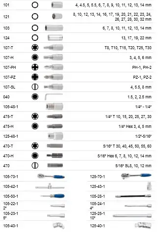 • Set nasadnih ključeva koji sadrži sve ključeve kratke, duge, nastavke raznih dužina, 2 račne, kao i najupotrebljivije bitove