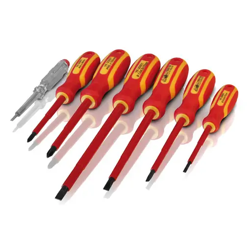 Set šrafcigera za električare 7 kom ERBA.Puna izolacija.Ravni: 6,5x150, 5,5x125, 4x100, 3x75. Phillips: PH 1x80, 2x100.Električarski taster 100-250V CE. Sa magnetom. VDE -1000V.